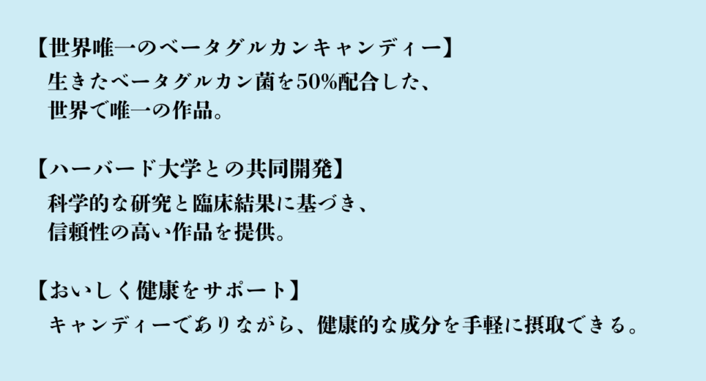 私たちが開発したベータグルカンキャンディーは、健康的な成分を楽しみながら摂取できる画期的な作品です。キャンディーの中に配合された生きたベータグルカン菌は、身体に優しい成分として、日常生活に取り入れやすく、気軽に健康をサポートします。