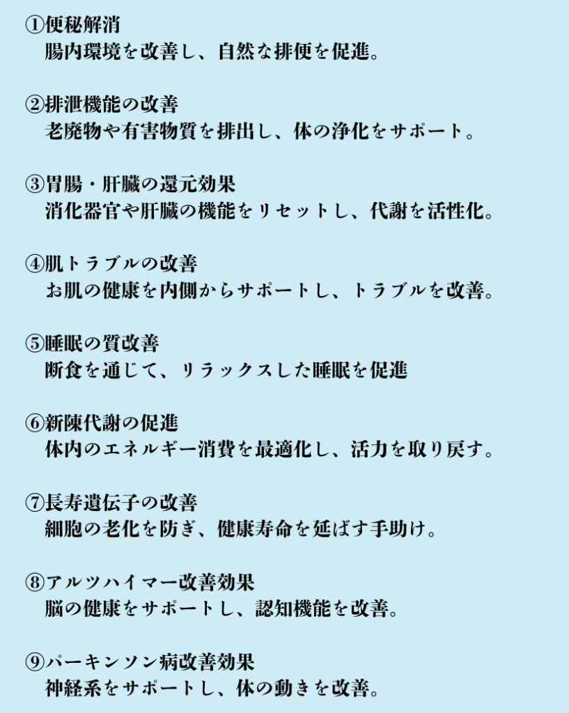 天澤断食クリニックの断食メソッドには、多くの健康効果が期待できます。