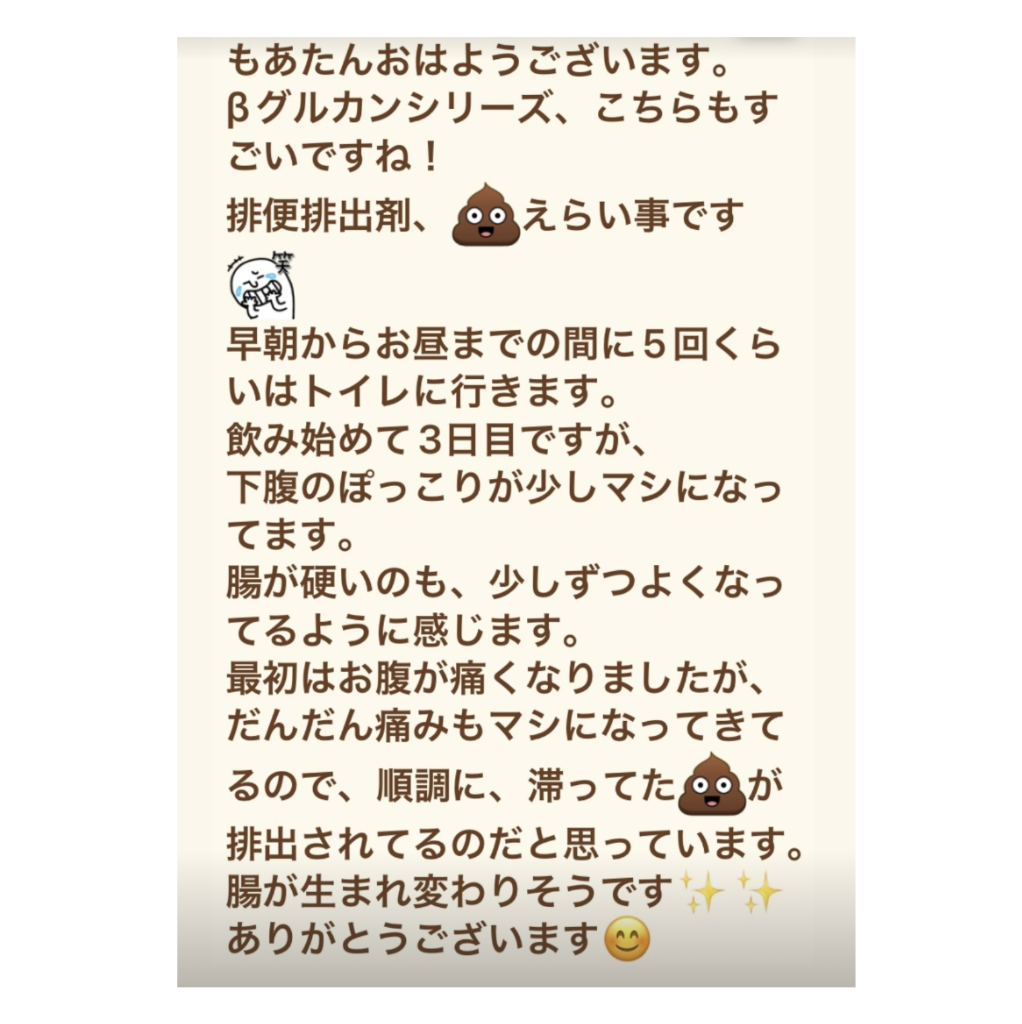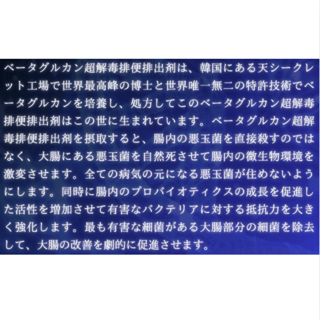 この作品には、20億個以上のベータグルカン菌が配合されており、腸内の健康を支えるために理想的な成分です。これにより、腸内フローラのバランスを整え、体調の改善をサポートします。