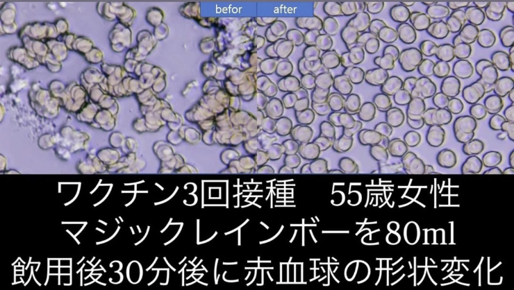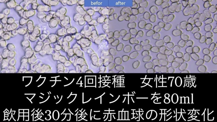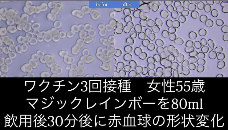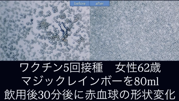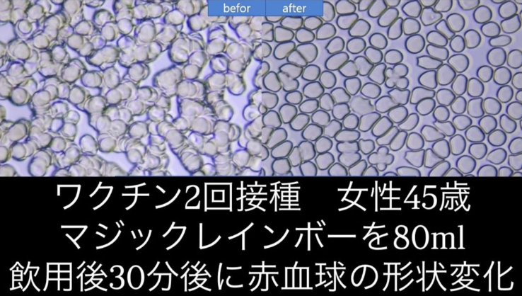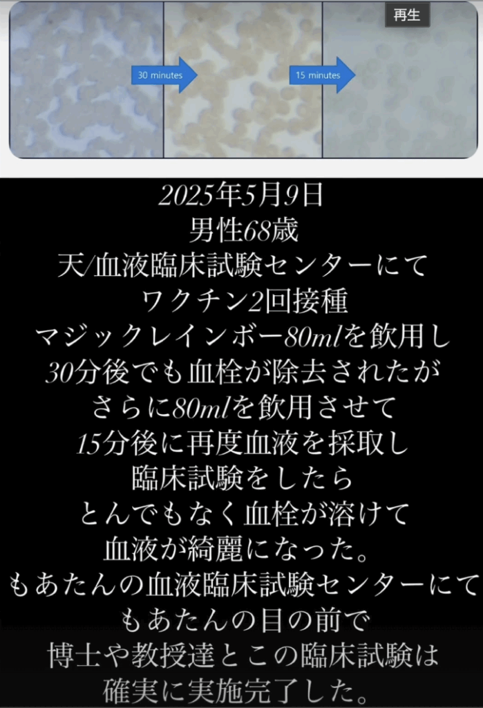 マジックレインボーを摂取した後、30分で血液が劇的に改善される結果が得られました。実際、血液臨床試験センターで再度血液を採取すると、血栓がとけて血液がきれいになっていたという驚くべき結果が得られたのです。