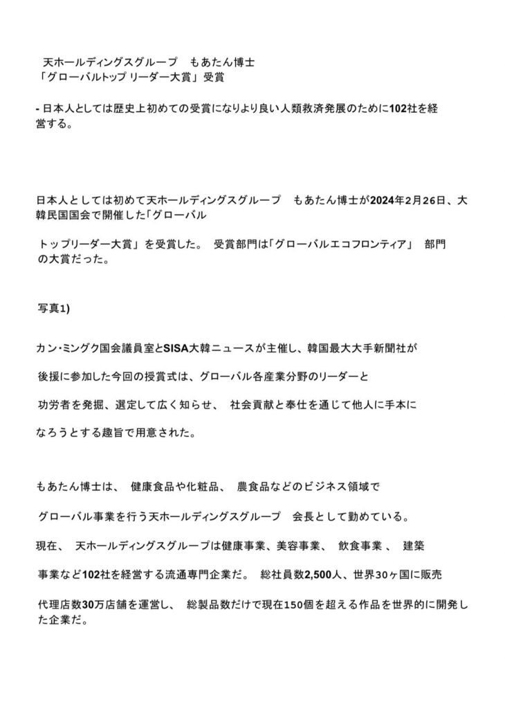 カン・ミングク国会議員質とSISA大韓ニュースが主催し、韓国最大大手新聞社が後援に参加した授賞式が行われました。