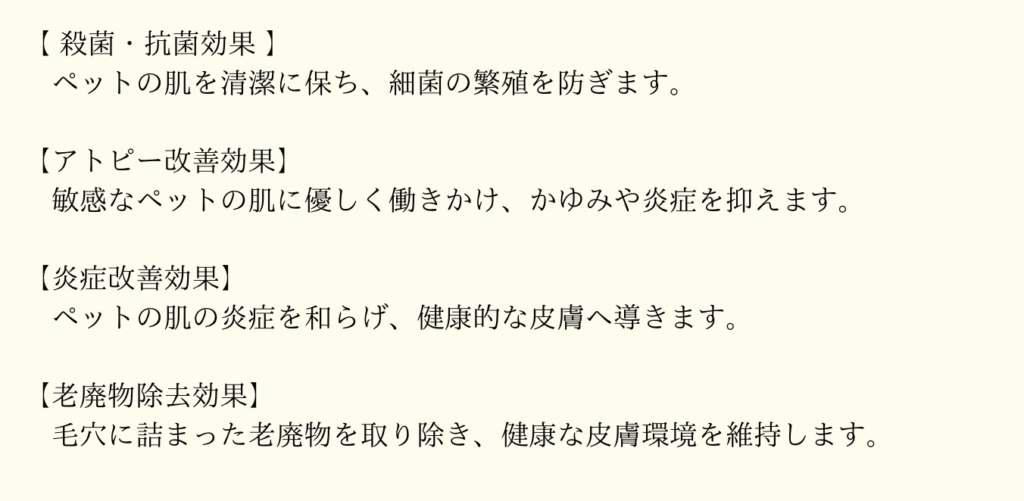 アトピー改善効果や炎症改善効果、老廃物除去効果、さらには殺菌・抗菌効果などが期待でき、ペットの皮膚を健康に保ちます。