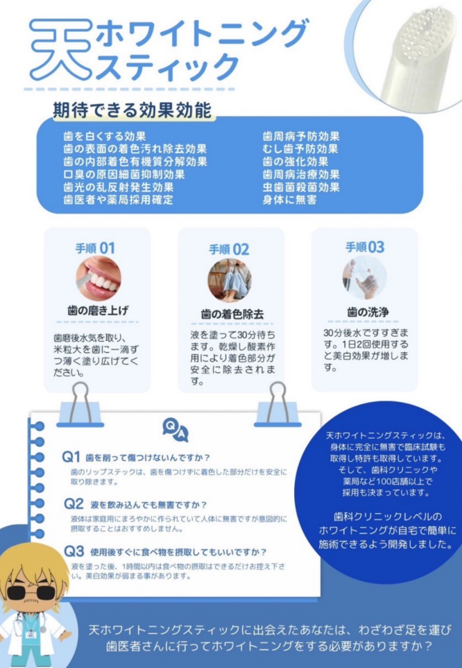 私たちの天ホワイトニングスティックは、臨床試験と特許を取得し、歯科クリニック100店舗で採用が決まっている実績を誇る製品です。歯科医院に足を運ばずとも、日常の歯磨きと合わせて安全で手軽にホワイトニングができます。