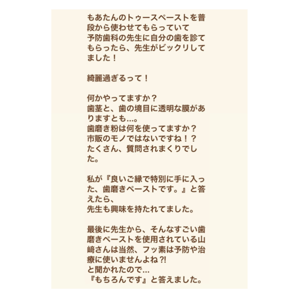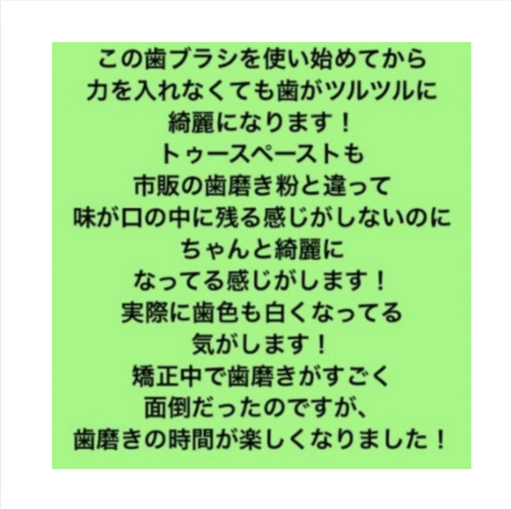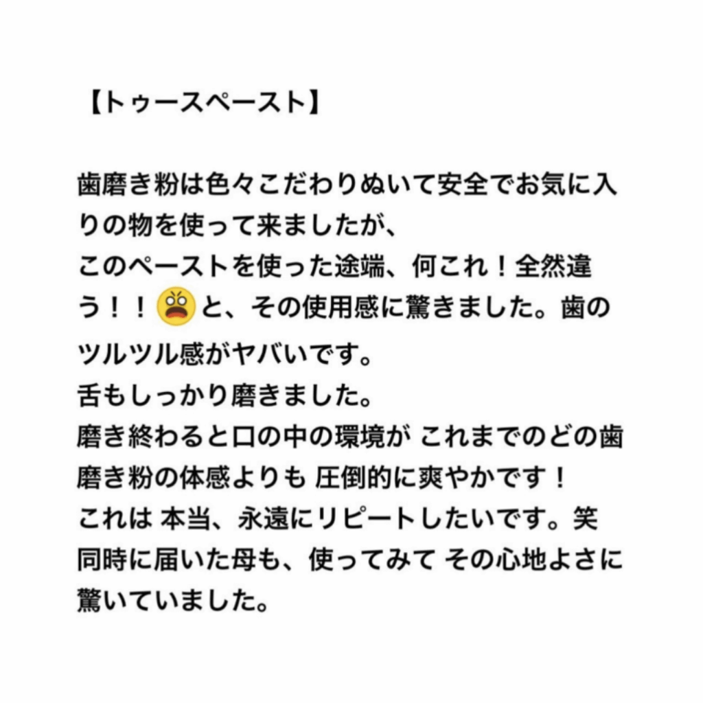 トゥーペーストという新しいタイプの歯磨きペーストも提供しています。これは、食べられる・飲める無添加の歯磨きペーストで、フッ素、サッカリン、界面活性剤、研磨剤、防腐剤は一切使用していません。安心して使用できる成分だけを使用しており、口腔内の健康を守りながら、清潔で爽やかな息を保ちます。